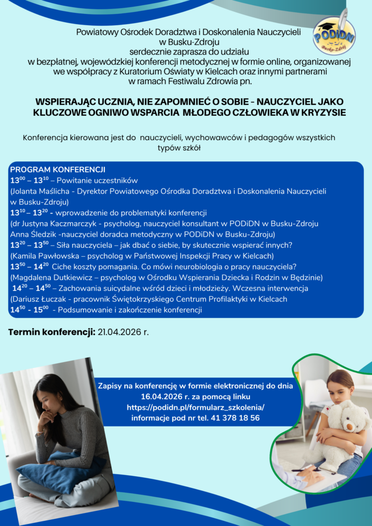Bezpłatna, wojewódzka konferencja metodyczna – WSPIERAJĄC UCZNIA, NIE ZAPOMNIEĆ O SOBIE – NAUCZYCIEL JAKO KLUCZOWE OGNIWO WSPARCIA MŁODEGO CZŁOWIEKA W KRYZYSIE Post category:Aktualności Post published:12 kwietnia 2026 Post last modified:17 kwietnia 2026 Read more articles Previous PostBezpłatna konferencja dla nauczycieli języka polskiego -„Najnowsza literatura dziecięca i młodzieżowa – wybór i możliwości wykorzystania w szkole” Następny wpisUwaga!!! -zmiana miejsca szkolenia – Raportowanie umów zawieranych przez jednostki sektora finansów publicznych w Centralnym Rejestrze Umów JSFP – nowy obowiązek realizowany w 2026 roku©